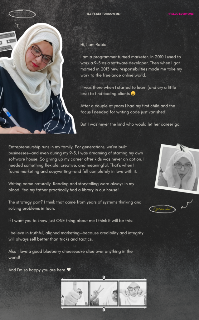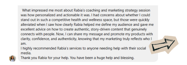 "I was concerned how I could stand out in such a competitive health & wellness space.....But rabia helped me define my target audience & Gave me excellent ideas on creating authentic story telling content"